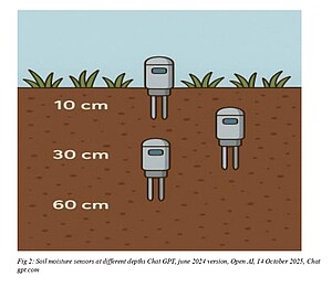 My research is about giving farmers a voice for their land. We’re using low-cost sensors and artificial intelligence to listen to the soil at different depths. It’s like a stethoscope for Earth, predicting exactly when and how much water is needed. We listen to the soil through tools like the sensor profile shown – tracking moisture across the root zone and revealing how long it takes for the water to transpire and evaporate, and when to irrigate.
